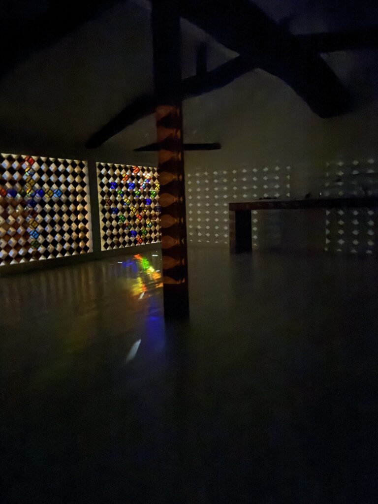 ブロックの角度をわずかに変える。ただそれだけの操作が、昼は強烈な太陽光を、夜は静謐な月明かりを、壁面を渡り歩く「色彩の奇跡」へと変容させる。自然の力と人間の創造力を一針ずつ丁寧に縫い合わせるこの体験こそ、ヴェガの提唱する「愛縫(アイヌイティ)」の結晶です。また、固定された静止物である格子が、天体の運行と連動して動的な色彩を放つという逆説は、もう一つの柱である「パラドックス」を体現しています。