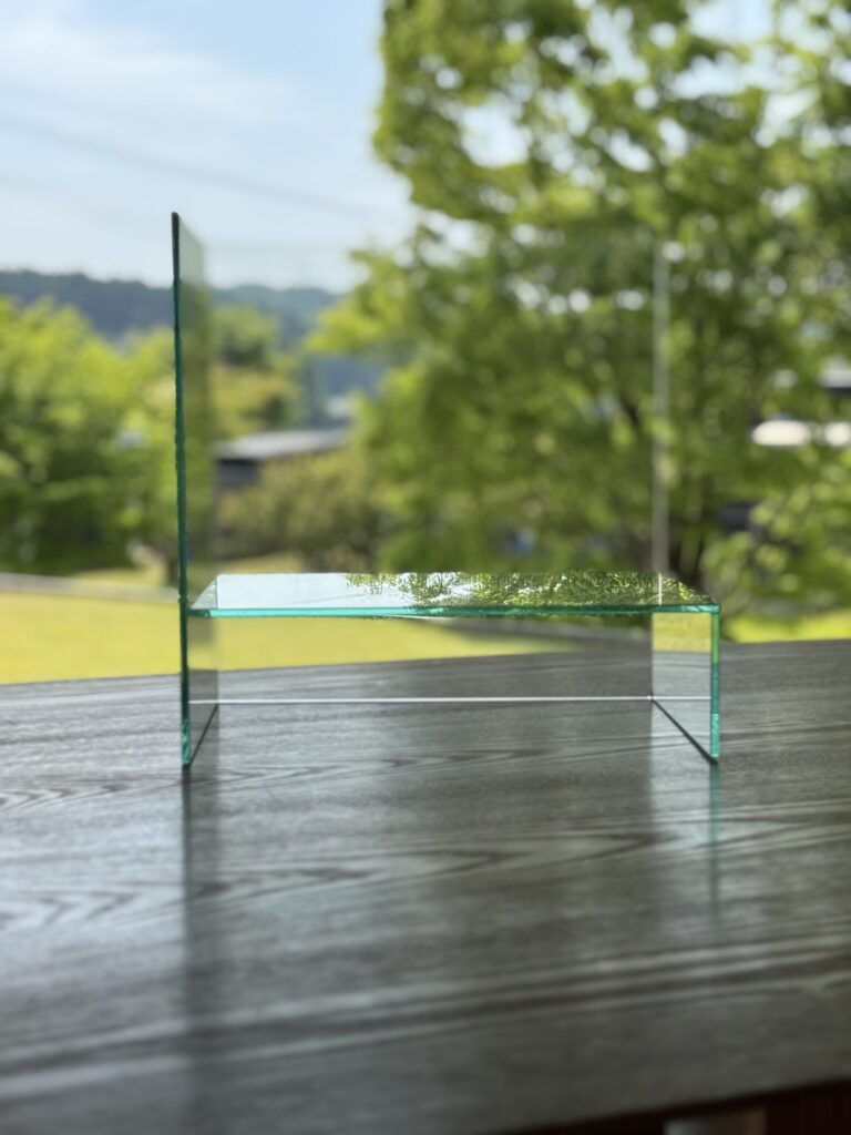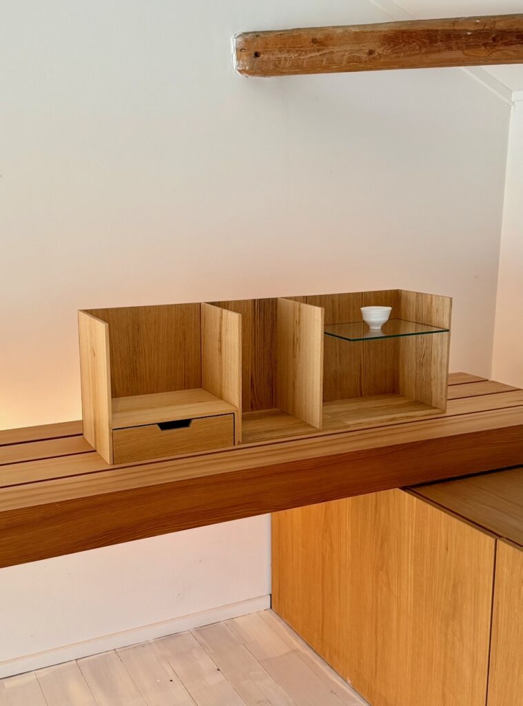 そこに存在するのは、完結した家具ではない。 木が語り、ガラスが光を通す。 二つのシェルフが放つ静謐な秩序は、家具エンジニア・柿谷朔郎氏の 精緻な手仕事によってもたらされた「完璧な余白」である。