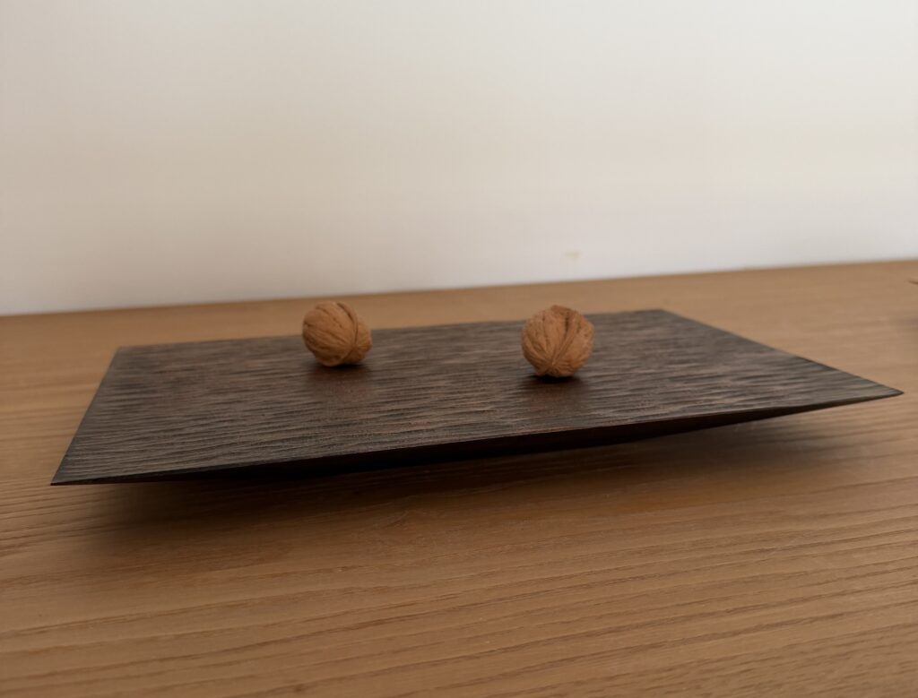 極限まで薄く、シャープに仕上げられた木のエッジ。 その上に何かが静かに鎮座するとき、 それは単なる器ではなく、静謐な演劇性を帯びたアートピースとなる。 対象の力強い質感や曲線美は、この完璧な「器(エンジニアリング)」によって初めて解放され、宇宙のすべて(Everything)を語り始める。